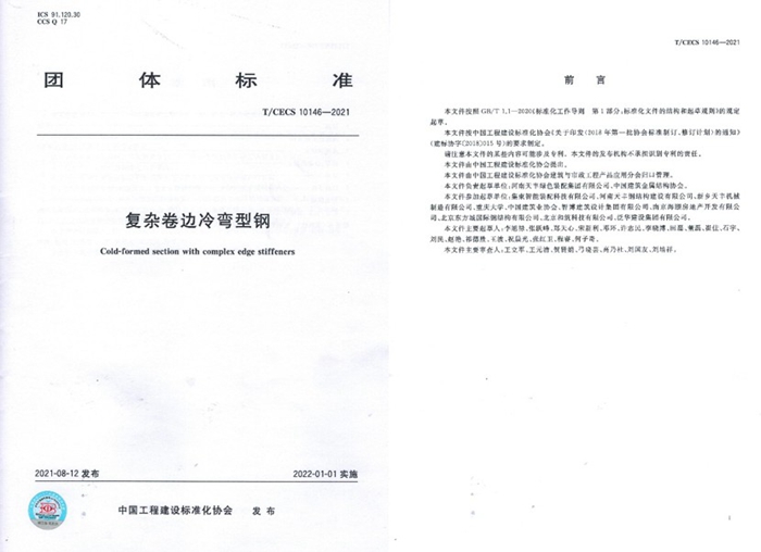 (2)主编《复杂卷边冷弯型钢》(T/CECS 10146-2021)、《复杂卷边冷弯型钢技术技术规程》两项CECS行业标准。《复杂卷边冷弯型钢》经专家评审一致认为技术内容总体达到国际先进水平。