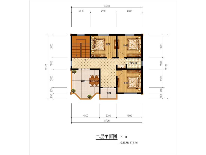 两层简欧风格别墅,建筑占地面积113.12平方米(11.2mX10.1m), 高度8.2米,其中一层层高3.4米,二层层高4.2米;总建筑面积197.29平方米,包括4室3厅1厨2卫,2露台。