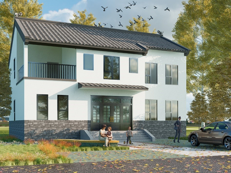 两层中式住宅,传统的青瓦白墙设计,淳朴典雅,质朴纯真。建筑占地面积145平方米(13.8mX10.2m),高度8.45米,其中一层层高3.4米,二层层高4.2米;总建筑面积289.82平方米,包括5室3厅1厨4卫,1洗衣房,1阳台。