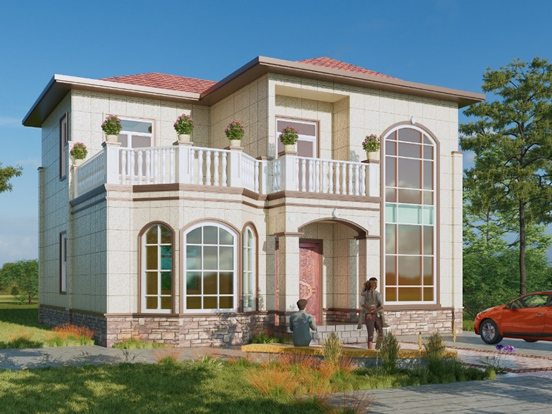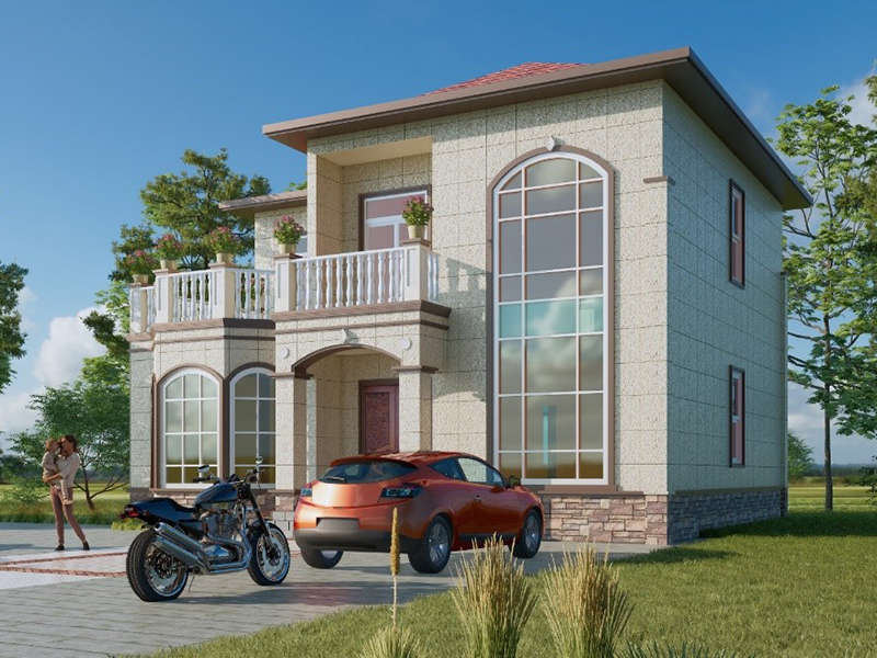 两层简欧风格别墅,建筑占地面积113.12平方米(11.2mX10.1m), 高度8.2米,其中一层层高3.4米,二层层高4.2米;总建筑面积197.29平方米,包括4室3厅1厨2卫,2露台。