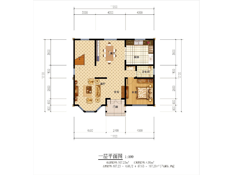 两层简欧风格别墅,建筑占地面积113.12平方米(11.2mX10.1m), 高度8.2米,其中一层层高3.4米,二层层...